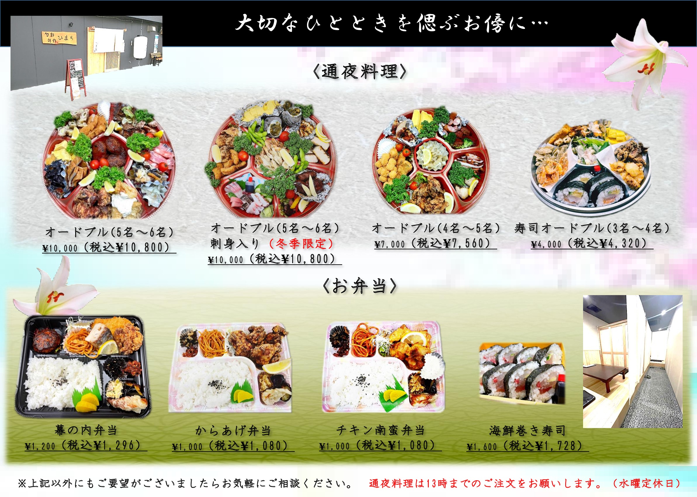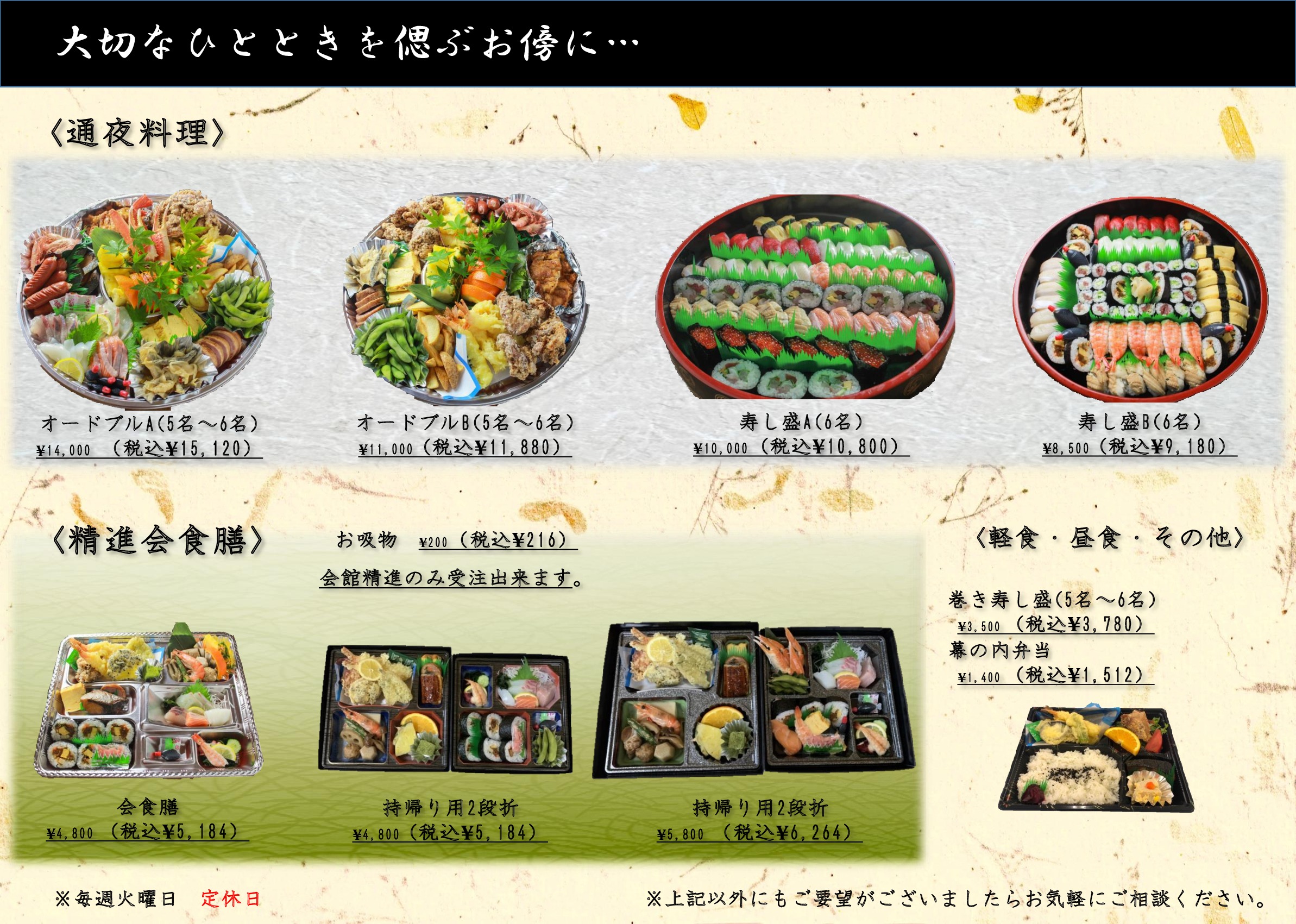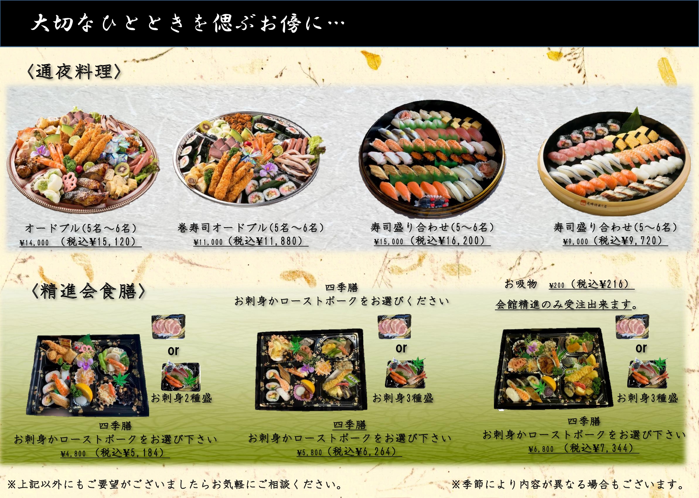 お通夜からご法要のお集まりのお席まで、人数・ご予算に応じて各種お料理の手配を承ります。